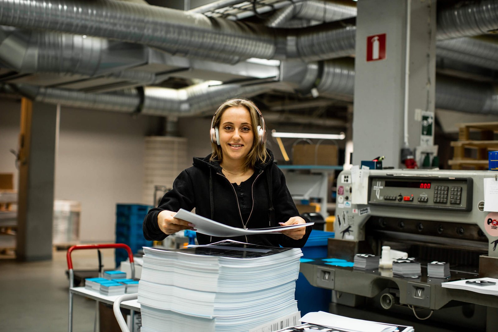 Sedan skickar jag vidare dessa till min kollega som står vid falsningsmaskinen eller klammermaskinen. När jag får de tryckta arken från tryckaren är min uppgift att skära bort kanter och skära ut rätt format som den färdiga trycksaken ska ha.