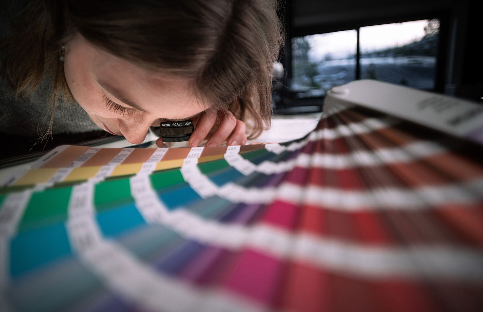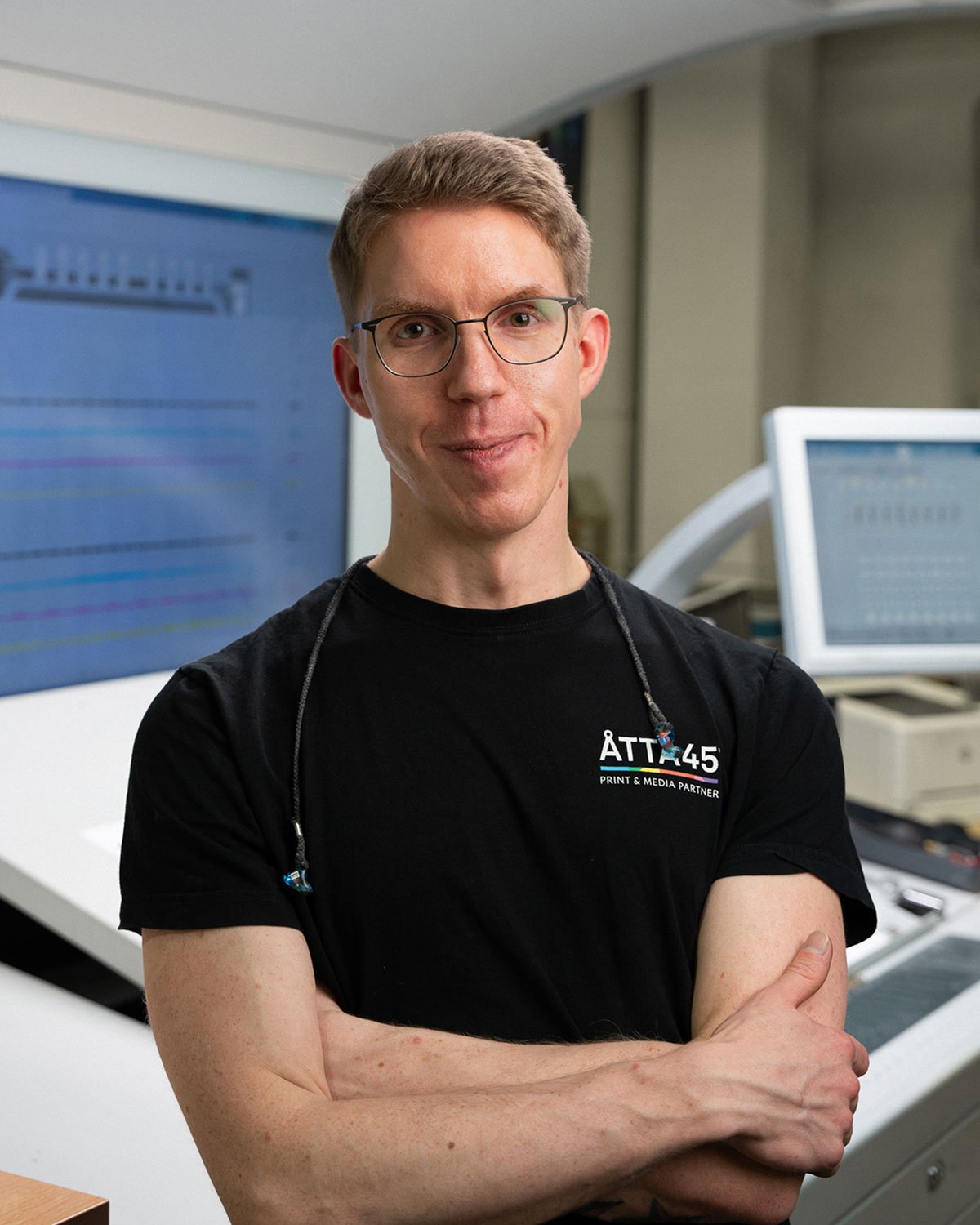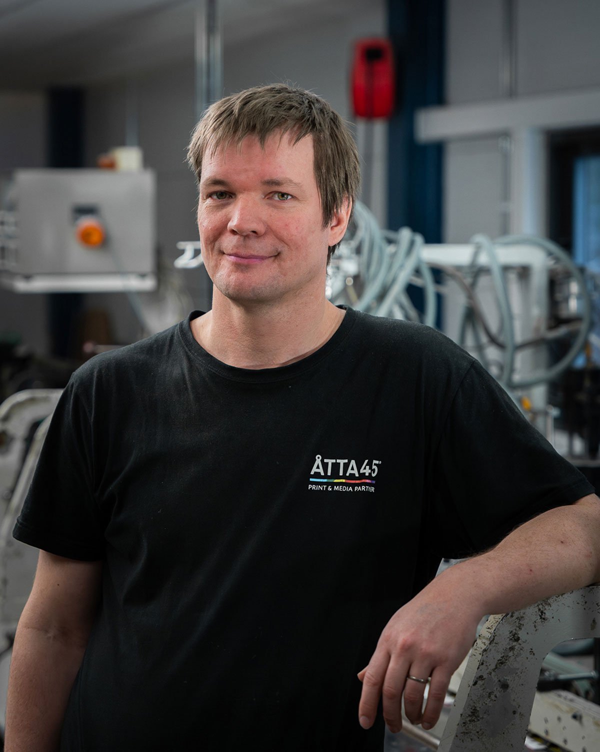 Jag jobbar som tryckare. Innan jag kör jobbet i tryckpressen ställer jag in färgerna mot färgprov eller mot branschstandarden för att allt ska bli snyggt och fint. Man behöver förstå hur maskinen fungerar och hur jobben ska se ut för att trycket ska bli som tänkt. Det är vi tryckare som kontrollerar att allt ser bra ut när det kommer från prepressavdelningen och sedan efter jobbet körts i tryckpressen.